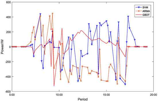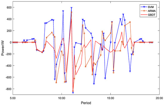 Figure 5, Figure 6 show the measured data of PV power, the output data of the prediction model based on the SVM algorithm, and the output data of the proposed prediction model based on the GBDT algorithm on a rainy day on September 1. As we can see in Figure 5, Figure 6, the fluctuation of photovoltaic power generation on rainy days is more severe than that of the sunny day. Faced with such severe power fluctuations, the prediction stability of the GBDT model is still higher than that of the SVM model and ARMA model.