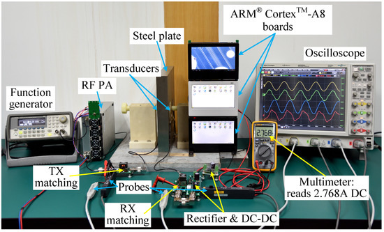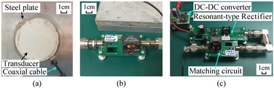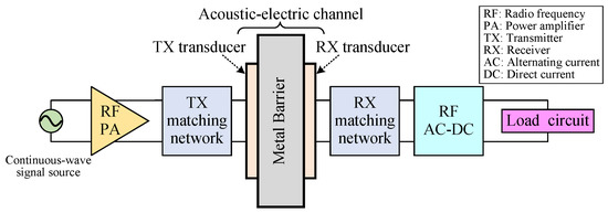The TX transducer is driven by the cascaded combination of a continuous-wave (CW) signal source and a 100-W linear RF power amplifier (PA) from Xinpin Technologies LLC (Shenzhen, Guangdong, China). The RX transducer picks up the transmitted ultrasonic wave. An RF AC-DC converter then converts the received CW signal into a usable regulated DC power supply, which can directly drive a load electronic circuit.