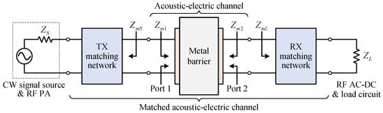To minimize unwanted electrical reflections at both ports of the acoustic-electric channel, electrical impedance matching networks are applied. The matching networks simultaneously conjugate match the impedance of the ports to 50 , which is a widely used characteristic impedance value in RF systems. The theory of simultaneous conjugate matching was firstly presented by Rahola [23] and firstly adopted in a UTMWPT system by Lawry et al. [17] The matching networks were designed according to the scattering matrix (S-parameters) of the acoustic-electric channel. For ease of analysis, a simplified model of the impedance matched acoustic-electric channel is shown in Figure 3. Note that the RF PA together with the CW signal source is simplified to a voltage source with an output impedance, , the RF AC-DC converter and load circuit are simplified to a resistor, . In addition, and both equal 50 .