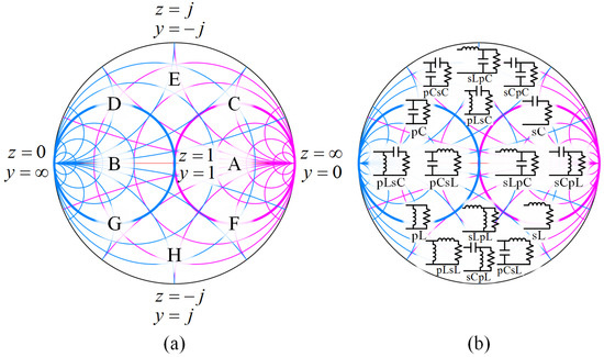 Normalized smith chart for matching network design: (a) Load regions; (b) Matching network topologies.