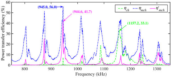 Figure 6 shows the power transfer efficiency of the unmatched channel, , and the theoretical power transfer efficiency of the matched channel, , which are calculated from the channel’s scattering matrix, . It can be seen from Figure 6 that the maximum efficiency of the unmatched channel is 33.1%, which occurs at 1157.2 kHz (denoted as ). Under the conjugate matched condition, the channel’s maximum efficiency occurs at 945.0 kHz and increases to 56.0% (denoted as ). The curves of and have a common periodicity. differs greatly from , the authors believe that it is mainly because the resonant frequencies of the commercial off-the-shelf transducers are not best matched with the thickness of the steel plate.