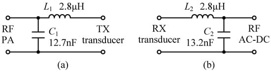 Matching network topology and component values: (a) TX matching network; (b) RX matching network.