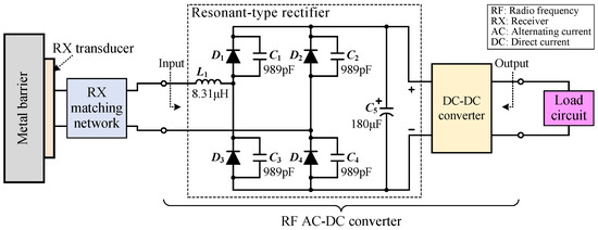 The RF AC-DC converter with input impedance matching efficiently converts the RF output of the RX matching network to a regulated DC voltage. This is the main superiority of our UTMWPT system over previous ones. The RF AC-DC converter used in the system is constructed from a resonant-type rectifier and a DC-DC converter as shown in Figure 8. The resonant-type rectifier was originally proposed by Matsui et al. [25] as a high DC voltage generator. Kusaka et al. improved it and developed an AC-DC converter from it for a magnetic resonance coupling WPT system [26,27]. We simplified the topology proposed by Kusaka et al., and redesigned it for our UTMWPT system.
