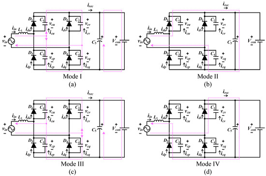 Operation modes of the AC-DC converter: (a) Mode I; (b) Mode II; (c) Mode III; (d) Mode IV.
