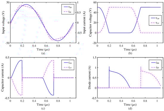 PSpice simulation waveforms of the AC-DC converter used in the system: (a) Waveforms of the input voltage and input current; (b) Waveforms of the voltages across and ; (c) Waveforms of the currents through and ; (d) Waveforms of the currents through and .