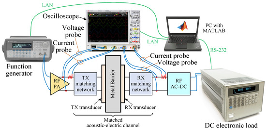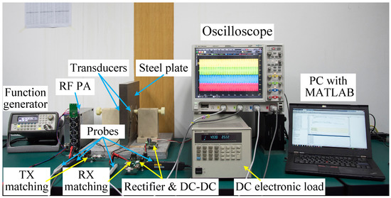 To verify the operation of the full system, the output power, power transfer efficiency, and port impedances were measured. The measurement configuration is shown in Figure 12. A Keysight 33220A function generator was used as the CW signal source. It was set to the continuous sine wave output mode. The measurements were carried out using a Keysight MSO9254A oscilloscope by connecting Keysight N2904A differential voltage probes and Keysight 1147B current probes to the input port and output port of the matched acoustic-electric channel. To measure the exact power output capacity of the system, a Keysight N3301A DC electronic load was used. It was set to the constant voltage mode. The function generator, oscilloscope and DC electronic load were all automatically controlled by a MATLAB (MathWorks Inc., Natick, MA) script on a personal computer (PC) to guarantee their synchronization. The fully automated measurements are faster, more objective and more precise than previous methods [15,16,17,18]. This is because the entire process does not require manual intervention and all measurement results are automatically read by the MATLAB script. Furthermore, the impedance mismatch caused by the error of the circuits, which was ignored in [15,16,17,18], was taken into account during the measurements. A photo of the measurement setup is presented in Figure 13.