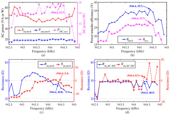 respectively. The values of , , and at the system’s most efficient point (944.4 kHz) can be read from Figure 14c,d. Then the values of the input impedances of the match channel and the AC-DC converter at the system’s most efficient point can be calculated as