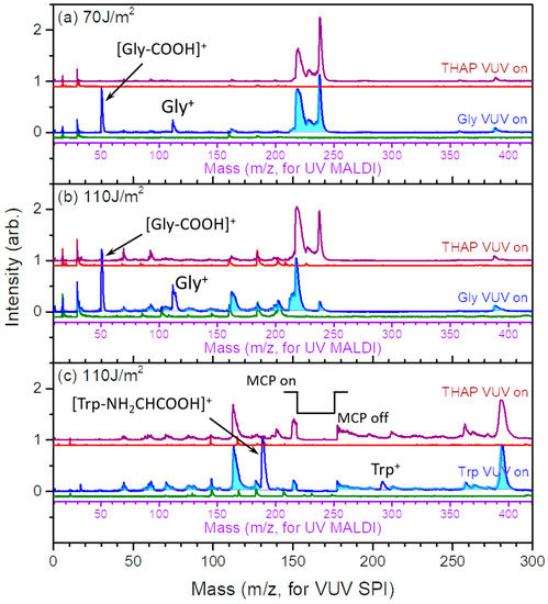 - Reilly, P.T.A.; Reilly, J.P. Laser-desorption gas-phase ionization of the amino-acid tryptophan. Rapid Commun. Mass Spectrom. 1994, 8, 731–734. [Google Scholar] [CrossRef]