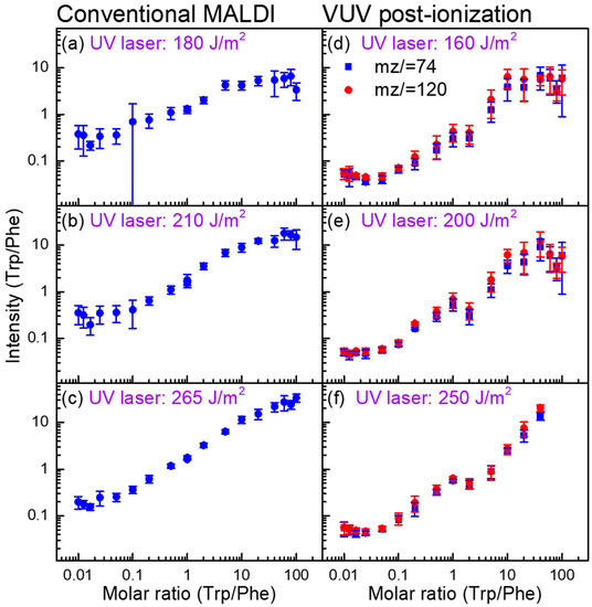 - Liang, S.P.; Lu, I.C.; Tsai, S.T.; Chen, J.L.; Lee, Y.T.; Ni, C.K. Laser pulse width dependence and ionization mechanism of matrix-assisted laser desorption/ionization. J. Am. Soc. Mass. Spectrom. 2017, 28, 2235–2245. [Google Scholar] [CrossRef] [PubMed]