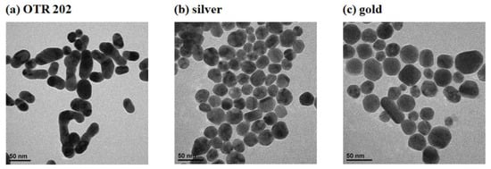 To investigate and find the optimal nanoenhancer, the enhancement effects of OTR 202 nanosubstrate, silver nanosubstrate, and gold nanosubstrate were compared and analyzed in this study. The structure diameter of OTR 202 nanoparticles, silver nanoparticles, and gold nanoparticles were characterized by Transmission Electron Microscopy (TEM) in Figure 3a–c respectively.