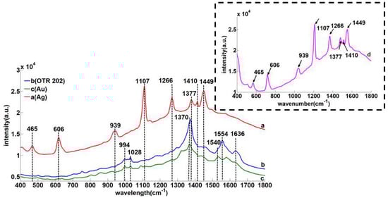 As can be seen in Figure 3, the nanoparticle sizes of OTR 202, silver substrate, and gold substrate were uniform. Moreover, the gold nanoparticle size was bigger than that of the OTR 202 and the silver nanoparticle, while the nanoparticle size of OTR 202 was the smallest. The SERS values based on the OTR 202 nanosubstrate, the silver nano-substrate, and the gold nanosubstrate are shown in Figure 4a–c respectively. According to these values, the enhancement performance of the Raman peaks of OTR 202 nanosubstrate at 994, 1028, 1370, 1554, and 1636 cm−1 were superior to that of the gold substrate. In addition, the Raman peaks of 1555 and 1630 cm−1 appeared when OTR 202 was used while those two Raman peaks did not appear in the SERS combined with the gold substrate, which indicated that the enhancement of OTR 202 was better than that of the gold substrate. The reason might be that the ultraviolet characteristic absorption peaks of urea and OTR 202 nanoparticles were more similar. Thus, the surface plasmon resonance of OTR 202 can be stimulated more easily, resulting in a higher detection sensitivity []. As for silver nanosubstrate, although there were seven stronger Raman peaks (465, 616, 939, 1107, 1266, 1410, and 1449 cm−1) in the SERS, these peaks also occurred in the SERS of soil extract without urea (Figure 4d).This might be because the peak signals of other substances in the soil extract were amplified, which covered up the molecular vibration of soil water-soluble nitrogen. Therefore, the OTR 202 nanoparticle was selected as the enhancer in the following study.