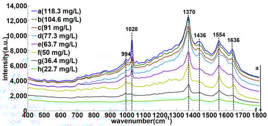 Characteristic peaks of SERS at eight different concentrations of water-soluble nitrogen: (a) 118.3 mg/L; (b) 104.6 mg/L; (c) 91 mg/L; (d) 77.3 mg/L; (e) 63.7 mg/L; (f) 50 mg/L; (g) 36.4 mg/L; (h) 22.7 mg/L.