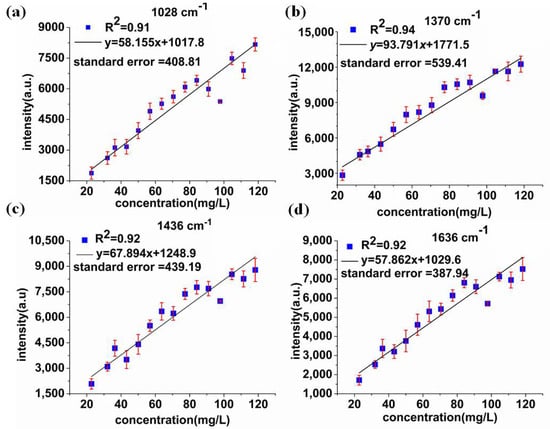 Based on the analysis, the regression equation between the characteristic peaks (1028, 1370, 1436, and 1636 cm−1) and the soil water-soluble nitrogen concentration was established. The fifteen point in each figure was the average SERS of fifteen different soil water-soluble nitrogen concentrations, the abscissa was the soil water-soluble nitrogen concentration, and the ordinate was the SERS intensity. The regression results are shown in Figure 7.