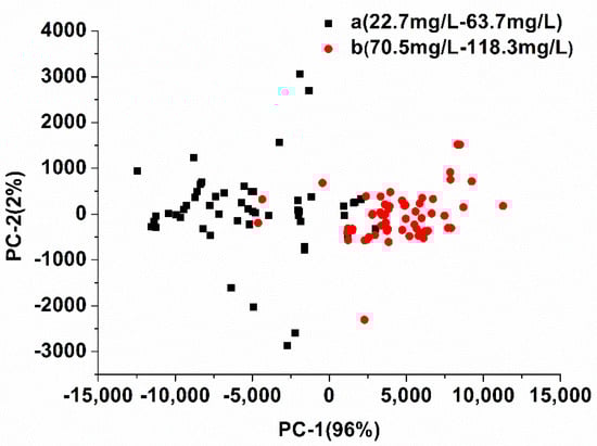 Given the division standard of soil water-soluble nitrogen in China [] and the combination with the soil water-soluble nitrogen concentration in this experiment, the soil water-soluble nitrogen concentration was divided into low concentration (22.7–63.7 mg/L) and high concentration (70.5–118.3 mg/L) to analyze. PCA was used to cluster the samples, and LS-SVM was applied for classification based on two principal components and four characteristics peaks. The total number of samples was 120, and the ratio between the calibration set and the prediction set was 5:3 using SPXY. Figure 8 presents the schematic diagram principal component analysis, and the LS-SVM predictive results are shown in Table 4.