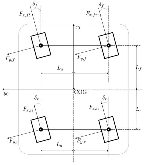 In earlier work, a production platform with a patented steering principle was developed [24]. This production platform exhibited very good maneuvering possibilities [25], but required eight dedicated drive motors and was restricted to flat floors. The innovative design allows driving in uneven environments and only requires four drive motors. The AGV’s main frame consists of four sprung arms that each dispose of one drive motor. The arms can freely rotate, but the front arms and the back arms are connected by belts. Each drive motor disposes of an angle encoder. This allows for determining the angle, the angular velocity and the angular acceleration of each wheel. Another set of two angular encoders measures the steering angle of the front wheels and the back wheels, respectively. The use of four individual motor controllers (electronic position control EPOS—communicating via the CANopen protocol) enables independent use of each drive motor. The ability to use four independent motors leads to a steering system that is already registered as a patent and is based on the concept to use the torque differences between wheels to steer the axles of a vehicle. The AGV can drive directly in any direction without time- and space-consuming turning maneuvers and is able to turn around its own center. Especially in narrow spaces that are common in production settings, this characteristic is very desirable. Still, the mechanical construction is rather simple, because no dedicated steering motors are necessary. This leads to a high robustness. Apart from the six angular sensors mentioned above, the robot is equipped with global acceleration, velocity and yaw rate sensors, whose measurements are available via the Bluetooth protocol. Figure 2 shows the main parameters of the steering system of the AGV with all the considered forces and the parameters are additionally listed in Table 1.