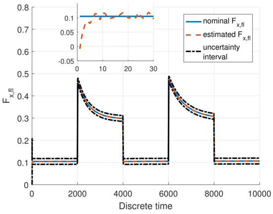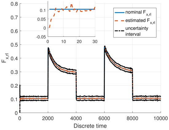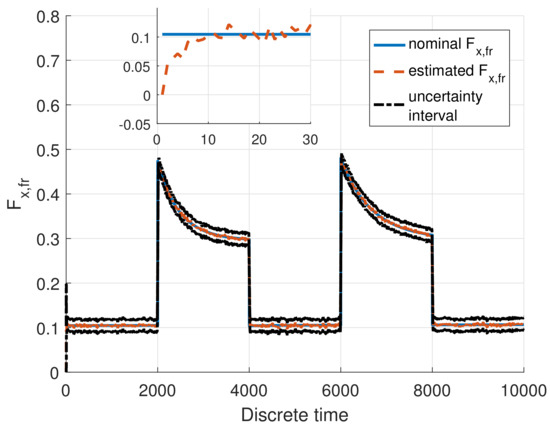 Following the above defined driving scenario, Figure 4, Figure 5, Figure 6 and Figure 7 present the longitudinal forces calculated with the model (nominal case) and their counterparts obtained with a set of measurements available from the AGV sensors. Note also that the plots show uncertainty intervals calculated according to (63) and (64). Analogous results are obtained for the torque, which are presented in Figure 8.