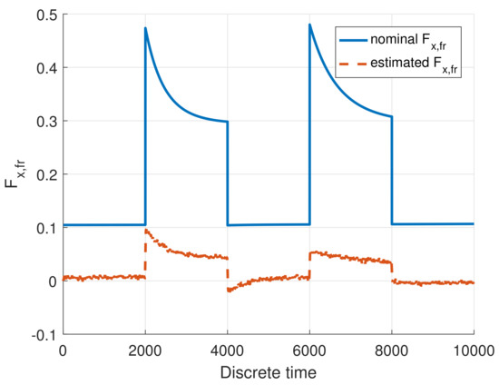 As it was mentioned in Section 6, the proposed estimation strategy can be also realized with an alternative approach, which employs the descriptor-like form [28] of the system (40). For that purpose, it is necessary to use the small angle approximation for which parameter in (38) is set to zero. This means that this matrix is constant and a singular one. Figure 9 presents a comparison between the nominal force and the descriptor-based one. Note that the results are presented for ; however, a similar effect can be observed for the remaining forces as well as the torque. Indeed, it can be observed that the descriptor-based approach does not perform satisfactorily. Taking into account the results obtained with the proposed approach, it can be concluded that the developed strategy can be perceived as a very good tool for estimating AGV longitudinal forces as well as the torque.