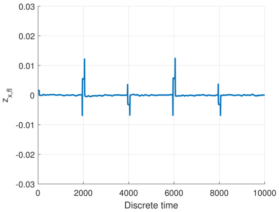 It can be observed that the estimates are consistent with the longitudinal forces and torques obtained by the model and the forces are equally distributed among the wheels. Indeed, Figure 10 presents the residual , which clearly indicates that it is close to zero for the fault-free case except for some transient phases corresponding to fast changes in the steering angle. As can be seen in Figure 10, the residual centers nicely close to zero, clearly indicating the fault-free, nominal case. The same situation occurs for the remaining wheels as well as the torque, which are omitted.