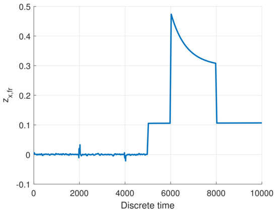 If the virtual sensors operate properly in the fault-free case, then their performance can be evaluated in the fault case. For that purpose, the AGV was steered to two overlapping surfaces in a manner that one of the wheels was hanging in the air. In particular, the front right wheel had no contact with the surface, and, hence, it did not generate the longitudinal force appropriately. This unappealing phenomenon was immediately indicated by residual which is shown in Figure 11.