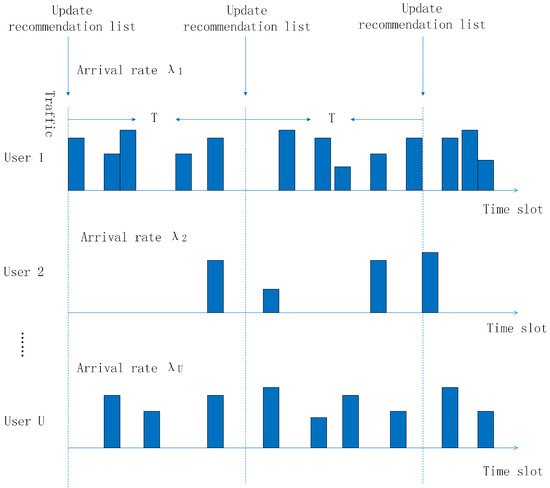 The asynchronous user behavior and the resulted traffic demand model are illustrated in Figure 2. The time is divided into frames of duration T. Each time frame is further divided into n time slots. The list of content recommendation is updated at the beginning of each time frame. Within the time frame, we assume that users will browse the recommendation list and request content from the list in an asynchronous manner. It is assumed that the behavior for user u to request a content at each time slot follows a Bernoulli process with parameter , which means the probability for user u to place a content request at the time slot t is