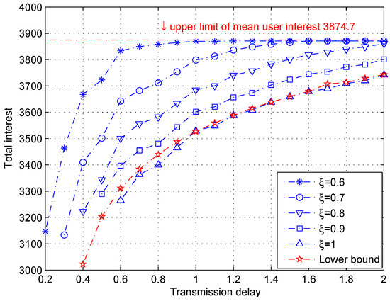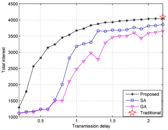 The total user interest as a function of the transmission delay with different algorithms (, and ).
