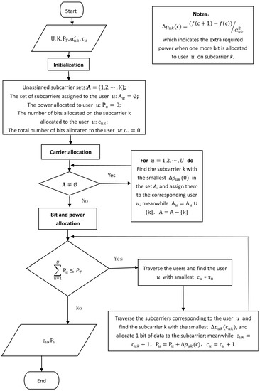 The flowchart of the algorithm is shown in Figure 4. We note that our proposed algorithm is computationally efficient with a polynomial complexity. More specifically, the time complexity is in the carrier allocation step and in the bit allocation step.
