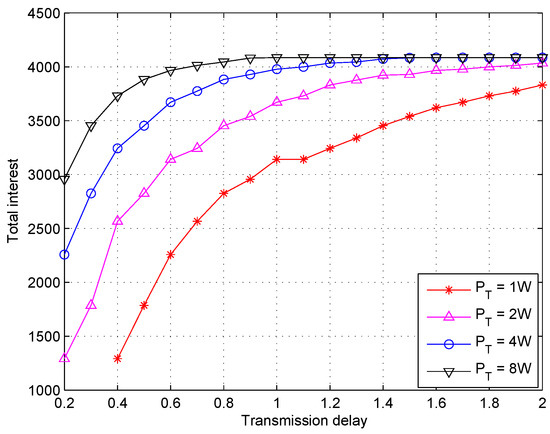 The total user interest as a function of the transmission delay with varying power constraint ( and ).