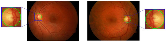 OD detection aims to find the location and area of ODs in retinal fundus images. In general, an OD has a very different appearance compared with the rest of the retina. It usually appears as a yellowish, circular, or slightly oval region brighter than the surrounding in fundus images. An OD is the exit point of ganglion cell axons leaving the eye, roughly one-sixth the width of the image in diameter [4,5,6,7]. Localizing the OD is the initial step of most vessel segmentation, disease diagnostic, and retinal recognition algorithms. It often works as a landmark and reference for the other features in fundus images [8,9,10]. However, because of the presence of eye diseases, light, and noise, the accurate detection of ODs is a challenging task and is the subject of much research.