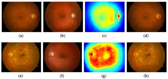 The steps of our method to detect ODs in normal fundus photography and fundus photography containing pathologies. (a,e) Target image. (b,f) The blue rectangle is marked as the template, the green circle is the true optic disc. (c,g) Confidence map. The red circle is the result of our method in the confidence map. (d,h) The red cross is the final detection result.