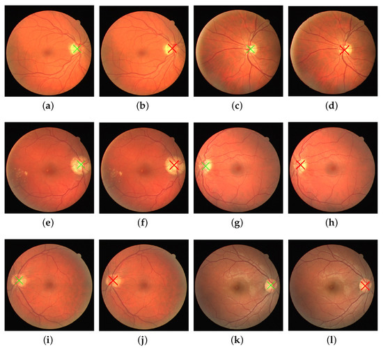Results of the proposed method (the red cross represents the estimated OD center). (a,c,e,g,i,k) The OD center annotation ground truth. (b,d,f,h,j,l) Results of the proposed method on the DRIVE database.