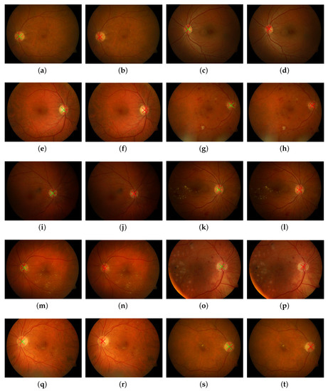 Results of the proposed method (the red cross represents the estimated OD center). (a,c,e,g,i,k,m,o,q,s) The OD center annotation ground truth. (b,d,f,h,j,l,n,p,r,t) Results of the proposed method on the DIARETDB1 database.