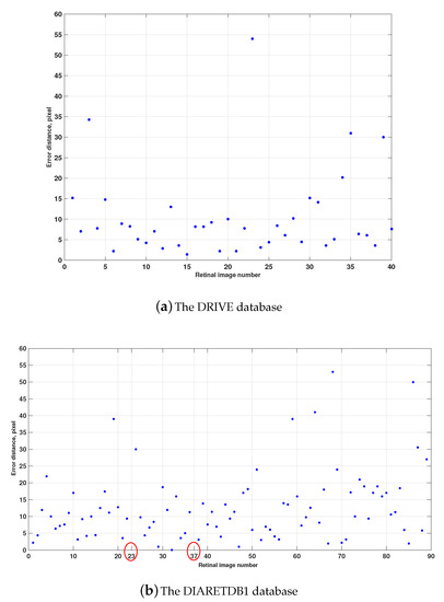 Error distances of OD detection for all databases. The numbers circled in red indicate images in (b) that failed to detect ODs.