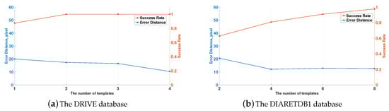 The error distances and success rates of the different databases computed using different numbers of template images are shown in Figure 6. The results of our method show success rates/error distances of 87.5%/20 pixel, 100%/17.37 pixel, 100%/16.54 pixel, and 100%/10.4 pixel when we construct template images from the DRIVE database, respectively. The success rates/error distances are 63%/20.58 pixel, 80.9%/13.1 pixel, 91%/12.9 pixel, and 97.7%/12.7 pixel when we construct template images from the DIARETDB1 database, respectively. Therefore, as templates increase, the detection success rate of the proposed method increases, and the error distances drop. The results show that the proposed method is validated, has better robustness, and can obtain very precise detection results by increasing the number of templates. We can determine the number of templates according to the different requirements of the actual application.