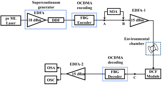 The experimental setup that we used for our investigation is shown in Figure 1. Here, the ps ML Laser produces a 1.8 ps single wavelength (1545 nm) optical clock at OC-48 rate (bit-width equal to ~400 ps), which is then passed through an optical supercontinuum generator (OSG) by PriTel, Inc. (Naperville, IL, USA). The OSG consists of a high-power erbium doped fiber amplifier and dispersion decreasing fiber (DDF). The optical clock from the ps ML Laser that was centered at 1545 nm after the amplification by an 18 dBm erbium doped fibre amplifier (EDFA) is injected into approximately a 1 km long DDF. This way, a 3.2 nm wide optical supercontinuum is generated in a spectral region of 1550–1553.2 nm. The supercontinuum is then spectrally sliced by an OCDMA encoder (OKI Industries, Saitama, Japan), which is based on four FBGs (central frequencies are: λ1 = 1551.72 nm, λ2 = 1550.92 nm, λ3 = 1552.52 nm, λ4 = 1550.12 nm) matching the 100 GHz ITU grid. The physical separation of individual FBGs is such that the encoder generates a following 2D-WH/TS OCDMA code: (1-λ2, 21-λ4, 24-λ1, 39-λ3). Here, the integer number leading λi represents the order of the time slot (called a chip) containing the carrier λi within the 400 ps long bit-width. This OCDMA code is then amplified by 15 dBm EDFA-1 and is transmitted through a 19.5 km long fibre spool that is located inside of the environmental chamber (SM-32C from Thermatron Industries, Holland, MI, USA).