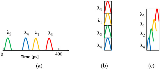 - Because of finite code carriers’ linewidth and DT being negative, they will experience a temporal narrowing (squeezing) [19] (see Figure 2c). This result is opposite to the CD effect where the chromatic dispersion coefficient DCD > 0, and it would therefore cause temporal broadening of the code carriers.