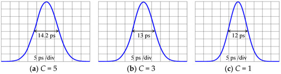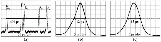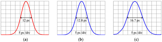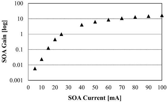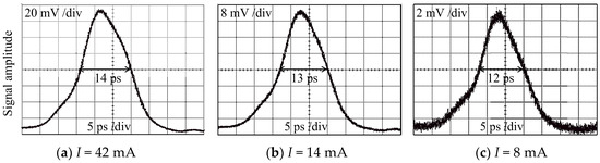 Figure 5 shows the experimentally obtained OCDMA auto-correlations that were recovered by the OCDMA decoder when the OCDMA code first passed the biased SOA and then travelled L = 19.5 km in the transmission link that was exposed at temperature T = 50 °C. The OCDMA auto-correlations that are shown in Figure 5a–c were obtained for SOA bias currents I = 42 mA, 14 mA, and 8 mA, respectively, and resulted in respective FWHM values of 14 ps, 13 ps, and 12 ps. The loss/gain of SOA w.r.t. the various bias currents have been shown in Figure 6.