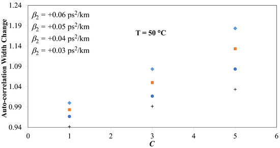 Next, we have investigated the cumulative effect of the varying value of the transmission link GVD (parameter β2) on OCDMA auto-correlation FWHM’s relative changes for the code transmission in an L = 19.5 km fibre link that was exposed to a temperature of T = 50 °C. We have shown (see Figure 8) that the impact of changing β2 (0.03–0.06) ps2/nm (affected by T = 50 °C) can also be compensated using the SOA by controlling the chirp of OCDMA code carriers.