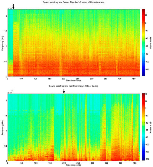 Sound spectrograms. Above is shown sound spectrograms for the metal/rock piece Stream of Consciousness (SC) (top) and the modern orchestral ballet music Rite of Spring (RS) (bottom). The novel loudness and brightness increase can be seen at 20.316 s (top), and the inharmonic frequency distribution of the unconventional polychord can be seen at 198.646 s (bottom).