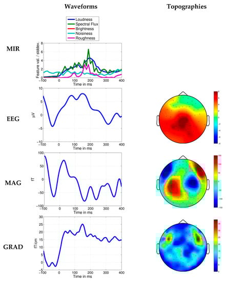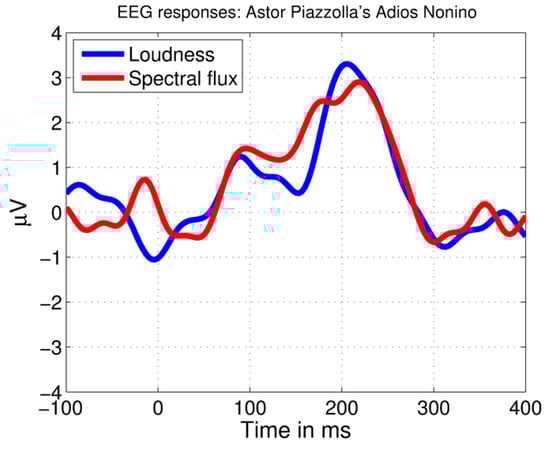 The automatic MIR analysis procedure resulted in successful identification of brain responses peaking ~200 ms after acoustical increases in the tango piece AN by Astor Piazzolla (more details are provided in Reference []) (Figure 2).