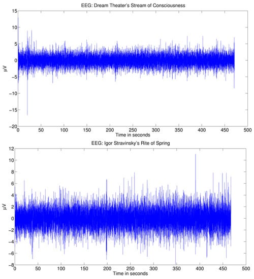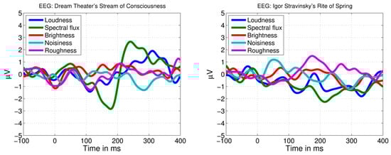 EEG responses to maximally distant acoustical feature increases. Average EEG responses are shown for Dream Theater’s Stream of Consciousness (left) and Igor Stravinsky’s Rite of Spring (right).