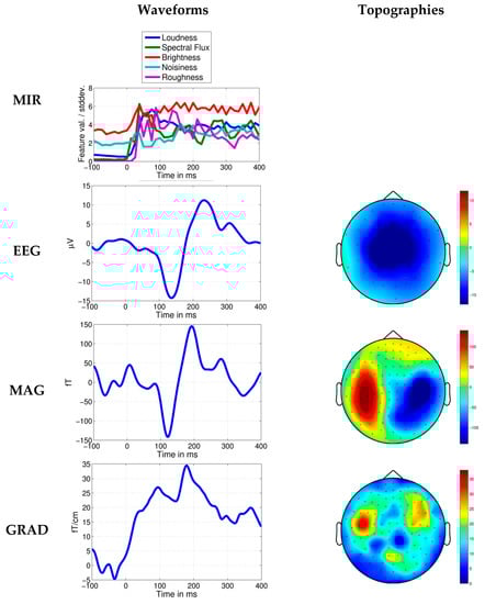 Response to the ‘Augurs’ chord in Stravinsky’s Rite of Spring. Average MIR feature values per standard deviation, EEG, MEG axial magnetometer (MAG) and MEG planar gradiometer (GRAD) waveforms shown 100 ms before and 400 ms after the time point at 198.646 s. Topographies in relation to the head are shown for the anterior MMN/ERAN-like brain response measured in a time window of ±15 ms around the peak. The MEG topographies suggest that frontal-central brain regions are involved in the response.