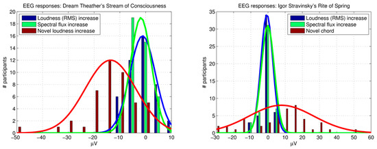 A relevant source of novel events in music is the change of level in acoustical feature parameters. With respect to loudness, the metal subgenre of rock music is in particular attempting to maximize perceived loudness []. This is achieved by applying loud bass drums, distortion and brightness increase filters on the bass and guitar, as well as dynamic range compression []. The perceived loudness can be further increased by habituating the listener to low levels of loudness and brightness, while subsequently increasing the level for these parameters (e.g., see Figure 1, top). A novelty-related brain response is typically evoked after briefly learning to expect a certain parametric level in acoustical features followed by a change in the acoustical parameter []. In addition, the novelty-related brain response can be evoked by novel events, which are infrequent in relation to the listener’s prior developed understanding of which events are frequent and infrequent in the music style before hearing the current music piece [,,,,,,,,]. To measure such novelty-related brain responses, it would be relevant to analyze the novelty of the musical events.