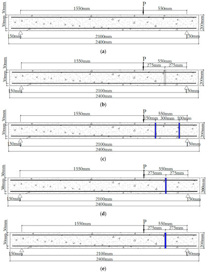 Details of test specimens in elevation: (a) Specimen coded as S-Con; (b) Specimen coded as S-D-1; (c) Specimen coded as S-S-2-10, S-B-2-9, S-G-2-9, S-C-2-9; (d) Specimen coded as S-C-1-9; and (e) Specimen coded as S-C-1-13.