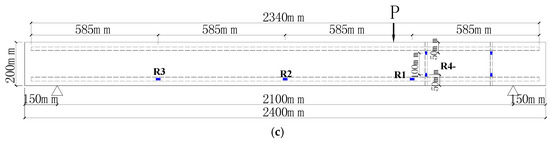 The experimental test specimens were created to investigate the behaviour of one-way slabs representative of the typical sections of full scale bridge deck slabs. According to previous tests of one-way shear behaviour of concrete deck slabs by the authors [15], the test slabs were 2400 mm long × 400 mm width × 200 mm depth, as illustrated in Figure 2 and Figure 3. A summary of the experimental details is presented in Table 1 and Figure 2. It is shown that the experimental programme involves eight test slabs. As presented in Table 1, the name of the test specimen includes all of its structural variables. For example, for the test specimen S-C-2-9, C is the strengthening material of CFRP (Carbon Fiber Reinforced Polymer), 2 is the strengthening configuration of two rows of embedment bars (see Figure 2c), and 9 is the diameter of embedment bars. Therefore, the variables to be investigated in this test are as follows: