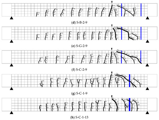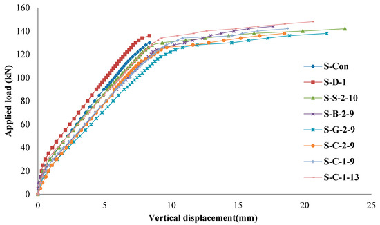 The crack patterns of all the strengthened test slabs are shown in Figure 9c–h. Similar to the unstrengthened slabs, multiple flexural cracks formed in the moment zone up to the appearance of shear cracks (the applied load reached 100 kN). As the applied load increased, the inclined shear crack appeared in the shear zone, particularly in the area between two embedment strengthening bars, as shown in Figure 9c–f. Interestingly, these shear cracks are prevented from opening further by the deep embedment strengthening bars. In addition, no shear cracks formed in the test slabs strengthened with large embedment bars (test specimen S-C-1-13). This indicates that the embedment strengthening bars crossed by the cracks are successful in preventing shear failure. Thus, the strengthened specimens are forced to a ductile flexural failure, as shown in Figure 10 and Figure 11. When the applied load reached the ultimate strength, the failure mode of all the test slabs with deep embedment bars was concrete crush at the loading positions. In all the tests, no debonding failure of embedment strengthening bars occurred. Due to this high bond-slip behaviour, the embedment strengthening materials do not influence the crack pattern and failure mode significantly.
