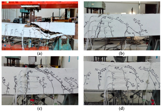 Comparisons of failure modes in the strengthened test slabs and unstrengthened test slabs. (a) S-Con; (b) S-C-2-9; (c) S-C-1-9; (d) S-C-1-13.