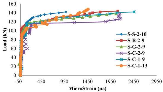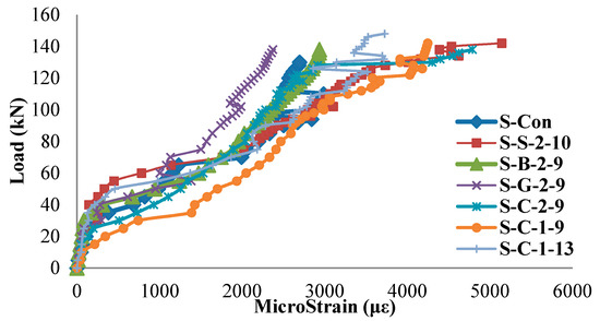 Figure 12 presents the curves of the load versus the maximum compressive strain of concrete slabs for the test specimens. It was observed that the curves have the same tendency for all the test specimens before the applied load reached the around 130 kN. This loading corresponds to the shear failure load of the unstrengthened test slab. Due to shear failure of the concrete slabs, the maximum compressive strain of concrete in the unstrengthened slab did not reach the crush strain (0.003) at the ultimate load. As the applied load increased, the compressive strain of all the strengthened test slabs increased more than the crush strain of concrete (0.003). It is noted that the failure mode of strengthened concrete slabs is flexural failure with concrete crush, which can be found in the observation of the test results (see Figure 10).