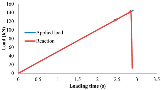 Applied load and reaction load vs. loading time in nonlinear finite element analysis (NLFEA) (Model S-C-2-9, Test failure load = 138 kN, NLFEA failure load = 144 kN).