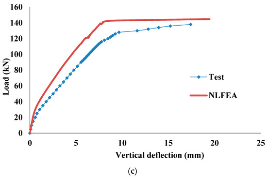 Comparison of load-vertical deflection responses: (a) Test model coded as S-Con; (b) Test model coded as S-C-2-9; (c) Test model coded as S-C-1-9.