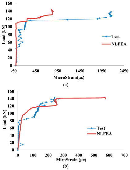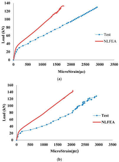 Comparison of load vs. strain in deep embedment strengthening bars: (a) Test model coded as S-C-2-9; (b) Test model coded as S-C-1-9.
